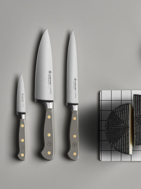 Sofisticado y elegante, este cuchillo es tu compañero de cocina ideal, listo para cualquier ingrediente. Para resaltar el tono distintivo y moderno de ostra aterciopelada, utilízalo mientras preparas champiñones silvestres, deshuesas un bistec perfectamente cocinado o rebanas carnes cocidas y quesos maduros para una bandeja.